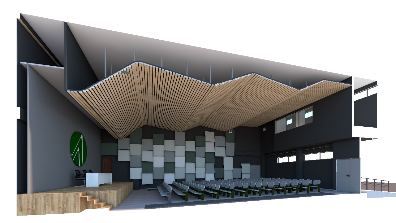 - El proyecto presentado consta de un edificio de seis niveles con espacios para auditorios, oficinas administrativas, áreas de co-working y usos múltiples.